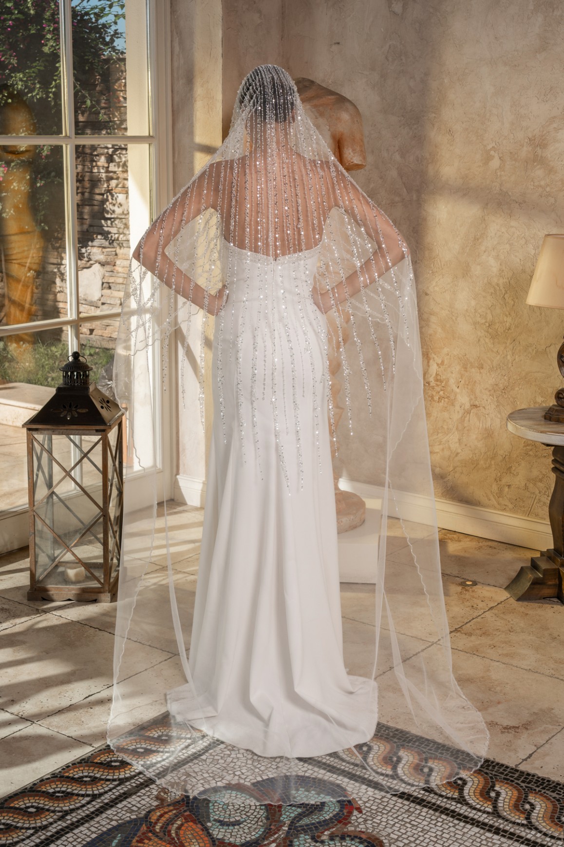 -2,3 metre uzunluğundaki bu tül duvak, gelinliğinizin uzunluğuna ve tarzına uyum sağlayarak etkileyici bir siluet oluşturur.